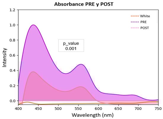 From a statistical standpoint, the null hypothesis (H0) was proposed that the absorbance distributions in the PRE and POST conditions are equal, against the alternative hypothesis (H1) which states there are differences between them. Given that the data correspond to measurements on the same sample under different conditions (PRE vs. POST) and normality was not assumed, the non-parametric Friedman test was applied, suitable for paired data in more than two measurements or in spectra discretized into multiple wavelengths. The analysis yielded a p-value = 0.001, below the α = 0.05 threshold, which allows rejecting H0 with a high level of confidence, concluding that the PRE and POST curves showed statistically significant differences (Figure 6). In terms of effect size, the observed discrepancy indicates not only a global difference but also a consistent spectral change, evidenced by a relative decrease in the area under the curve in the POST condition. This finding reinforces the hypothesis that optical irradiation with green light (10 J/cm2) caused a significant alteration in the cellular structure of the cell components.