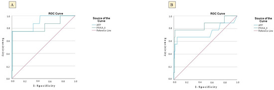 Parallel trends were observed in the CHC cohort. PIVKA-II achieved an AUC of 0.812 (SE = 0.046; p = 0.012) at a threshold of 47.2 ng/mL, yielding a sensitivity of 82.0% and specificity of 53.9%, mirroring its performance in CHB. The PPV for PIVKA-II in the CHC cohort was 16.23%, while the NPV was 98.1%, indicating a similar predictive performance. AFP in CHC patients produced an AUC of 0.824 (SE = 0.051; p = 0.020), with a sensitivity of 83.3% and specificity of 66.5% at a cut-off of 11.6 µg/L. The PPV for AFP was 9.49%, and the NPV was 98.1%, reinforcing AFP’s strong predictive accuracy (Table 4, Figure 1).