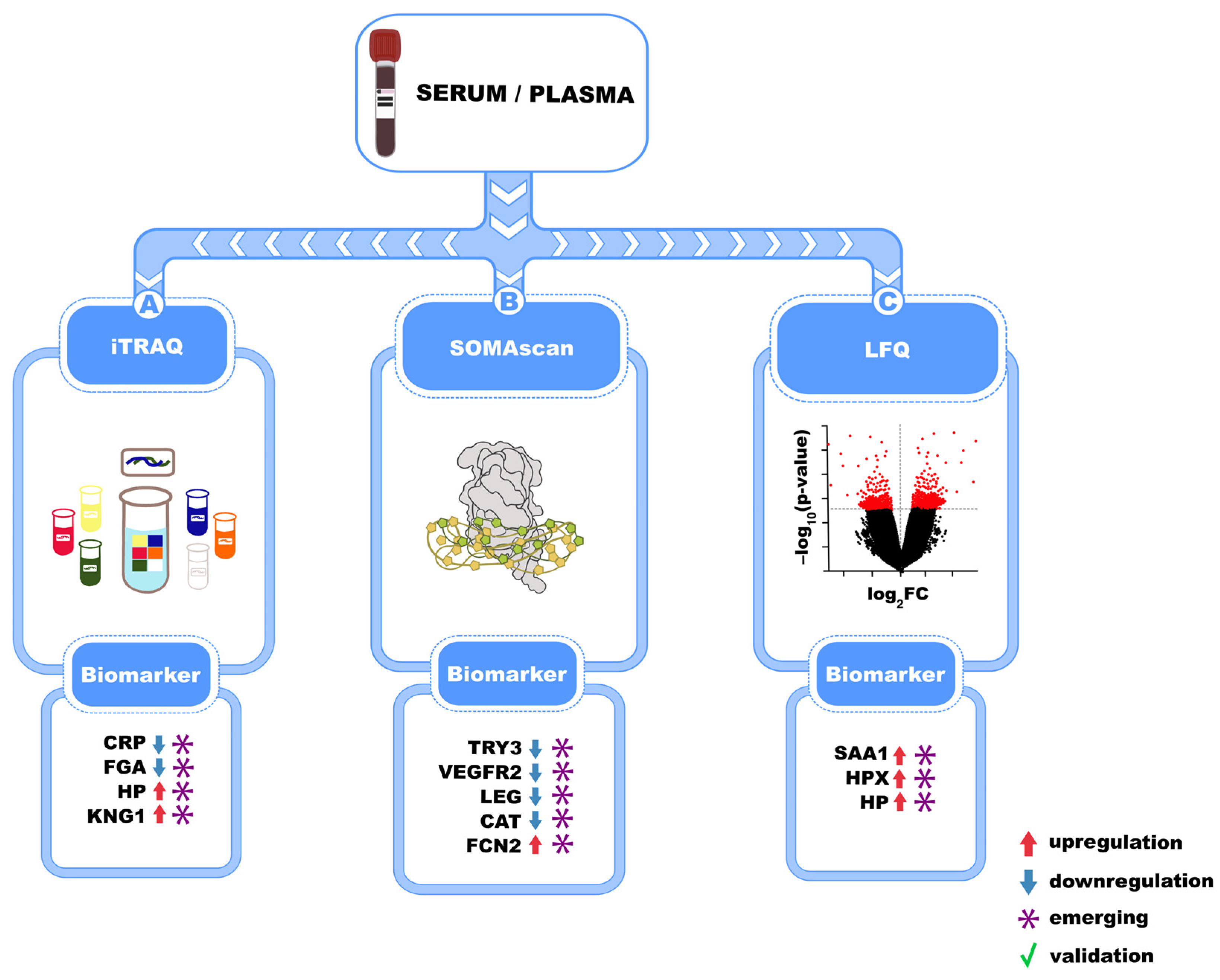 | iTRAQ + LC-MS/MS | CRP, Fibrinogen-α, Haptoglobin, Kininogen-1 | Systemic inflammation | Plasma | [46] |