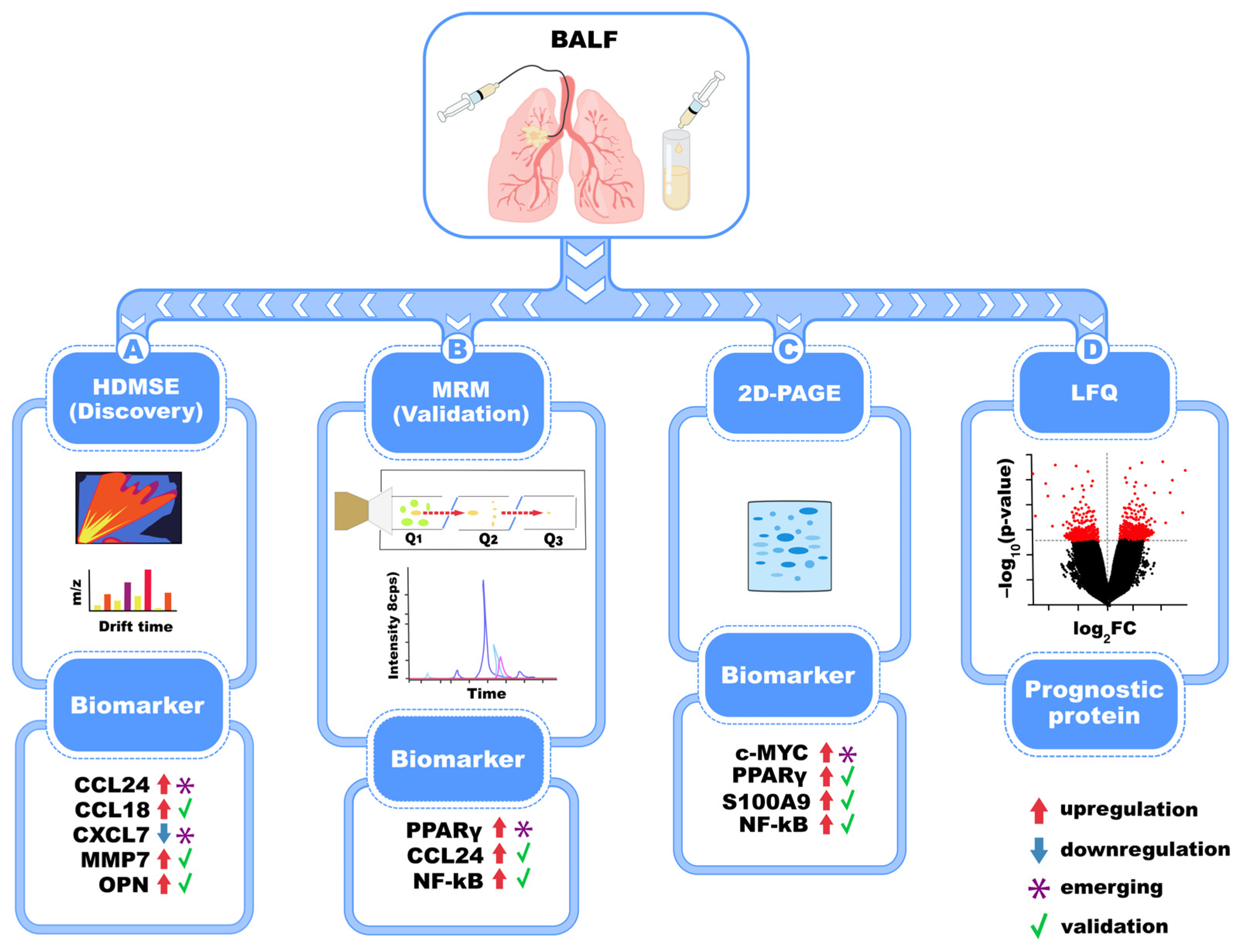 | HDMSE, MRM, 2D-PAGE, MALDI-ToF | MMP-7, CXCL7, CCL18, S100A9, ILs, MIF, Calgranulin B, CCL24 | Inflammation, ECM remodeling, cellular signaling | BALF | [48,49,50,51,52] |