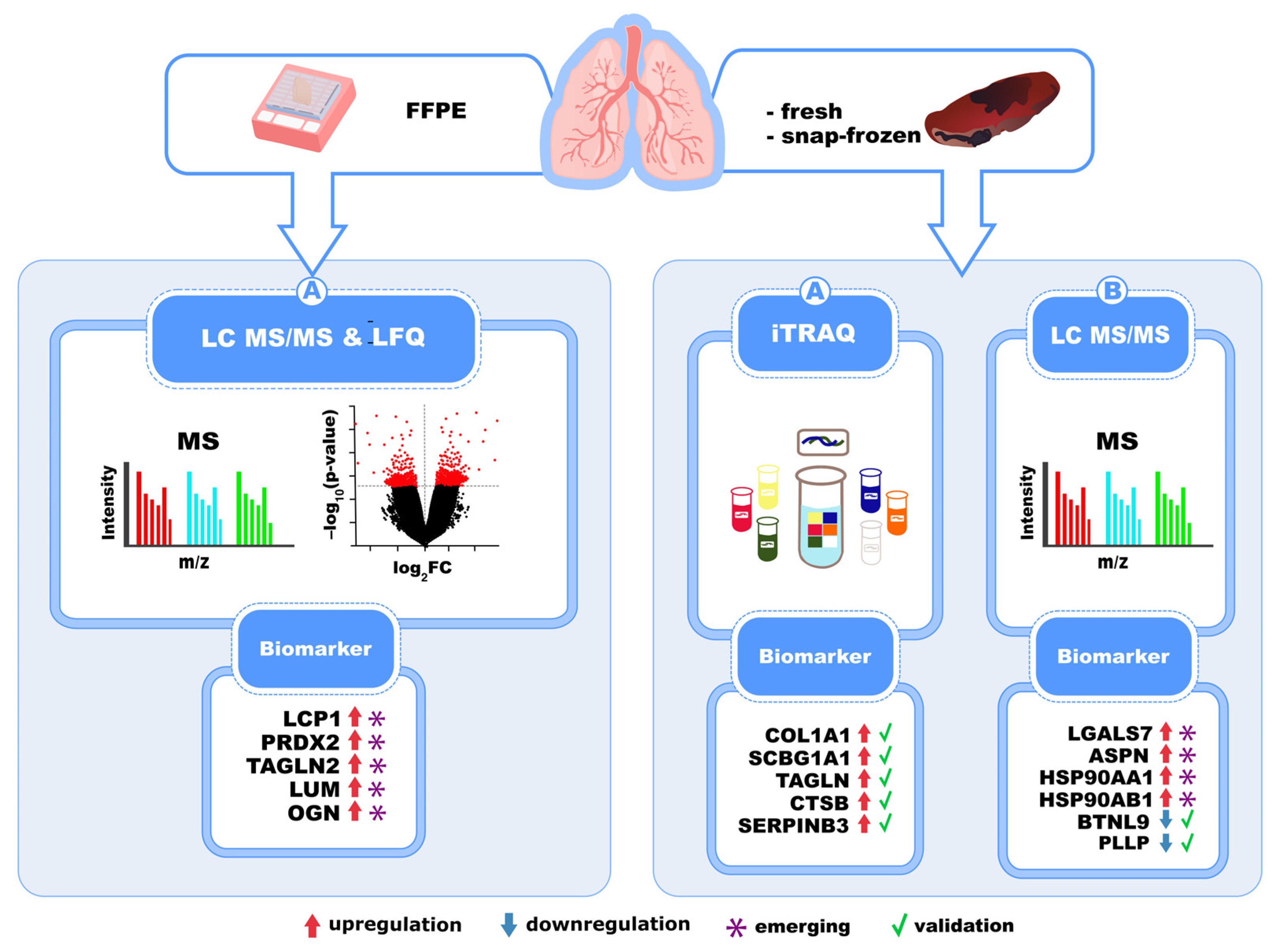 | LC-MS/MS (FFPE tissue) | LCP1, PRDX2, TAGLN2, LUM, OGN | TGF-β, cell adhesion, ECM | Lung tissue (FFPE) | [15] |