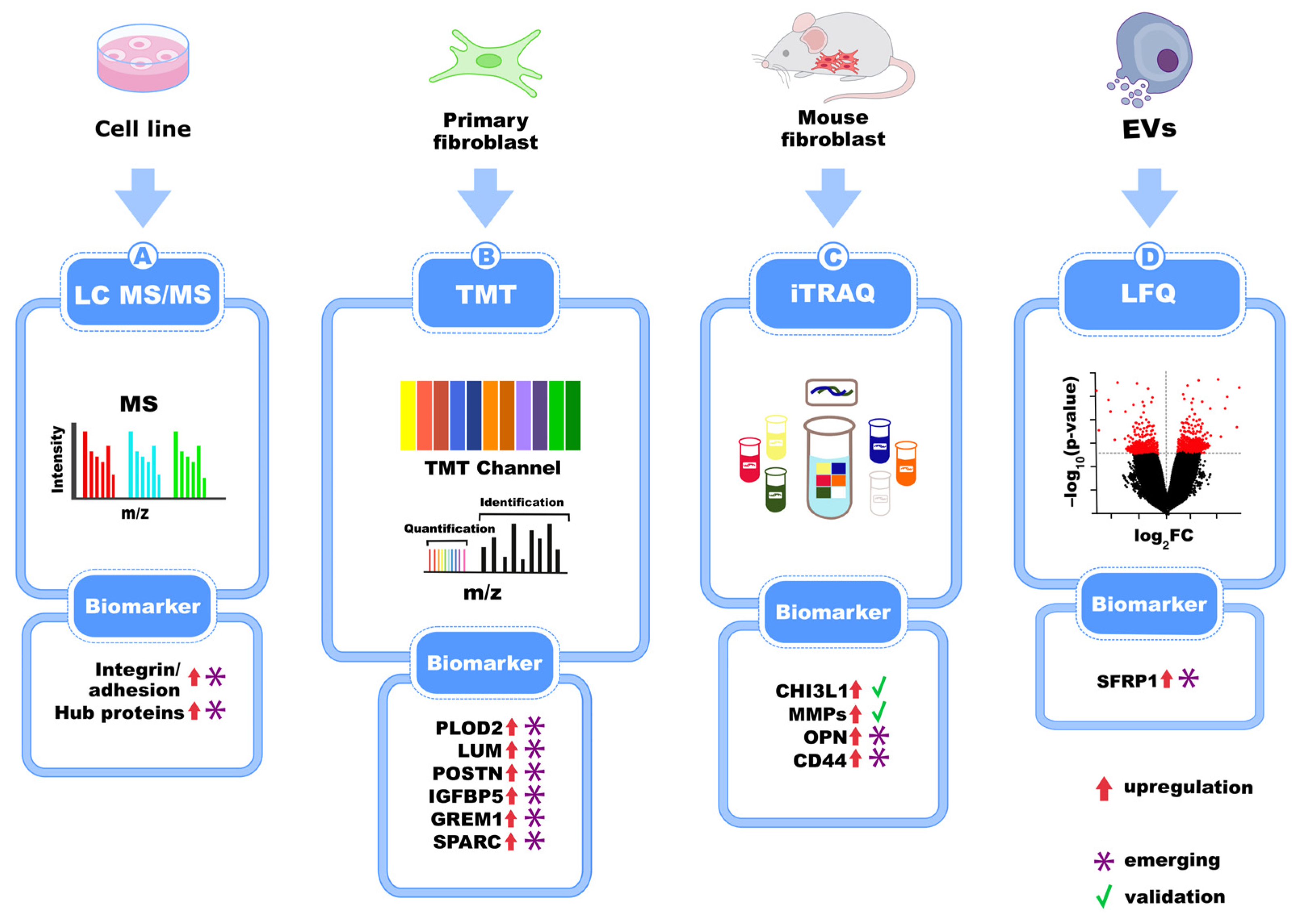 | LC-MS/MS | Periostin | TGF-β, IL-4, IL-13 signaling | Plasma/serum | [41,42,43] |