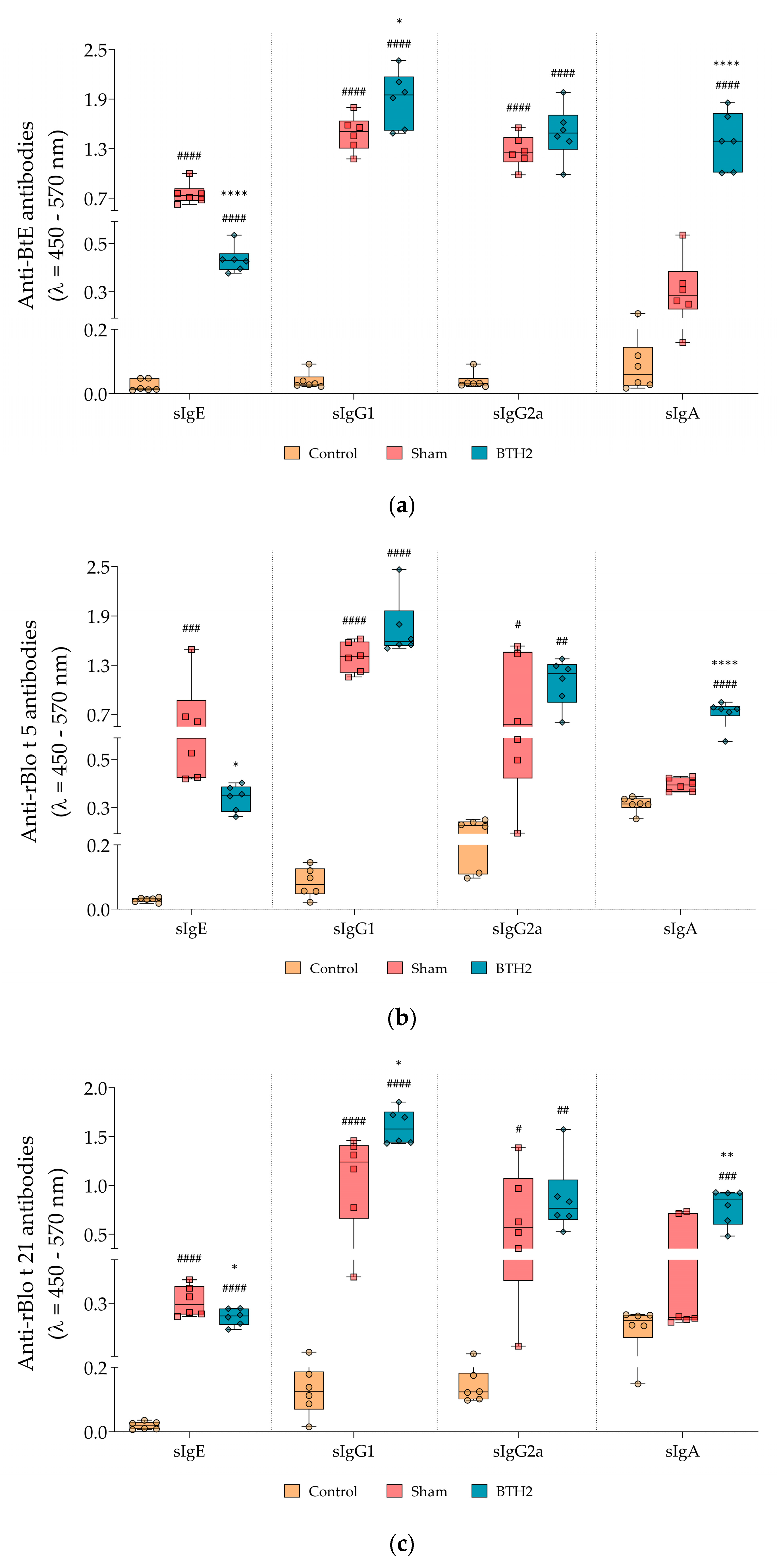 3.4. Prolonged Subcutaneous Administration of BTH2 Induces Mucosal IgA and Elicits Systemic IgG-Dominated Responses, Which Blocks IgE–Allergen Interactions