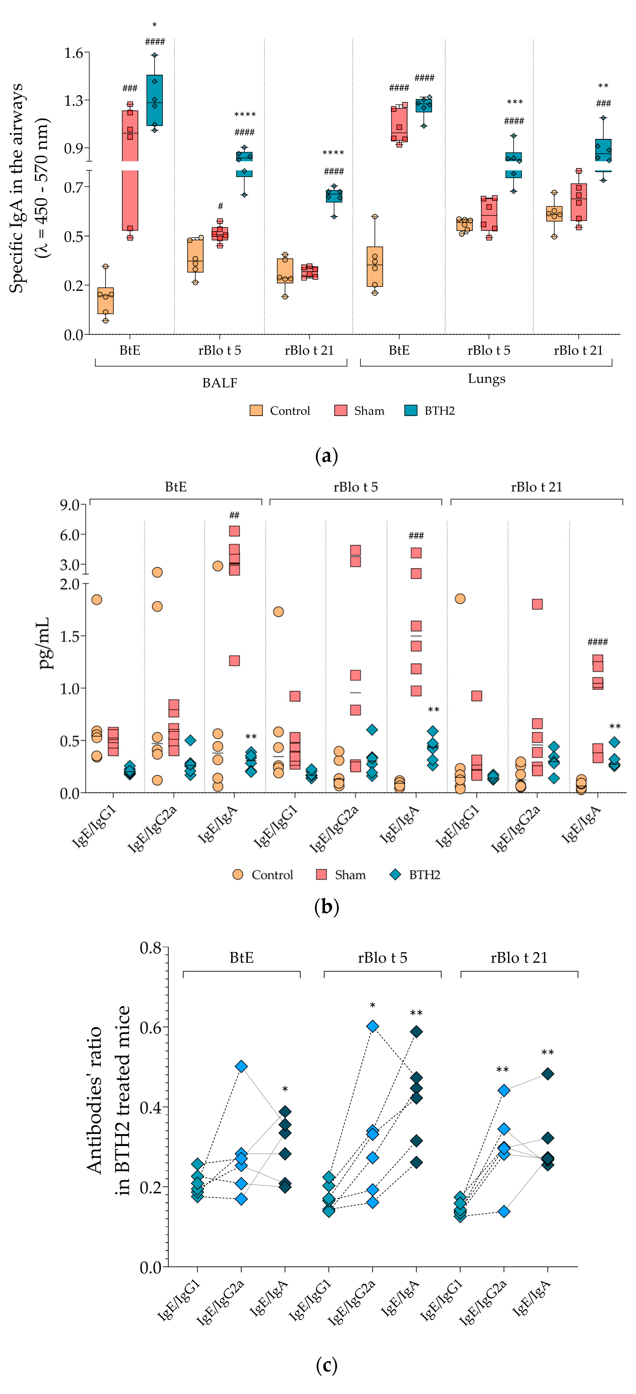 3.3. Long-Term Administration of BTH2 Promotes IgG and IgA Production and Suppresses sIgE Responses in Mice