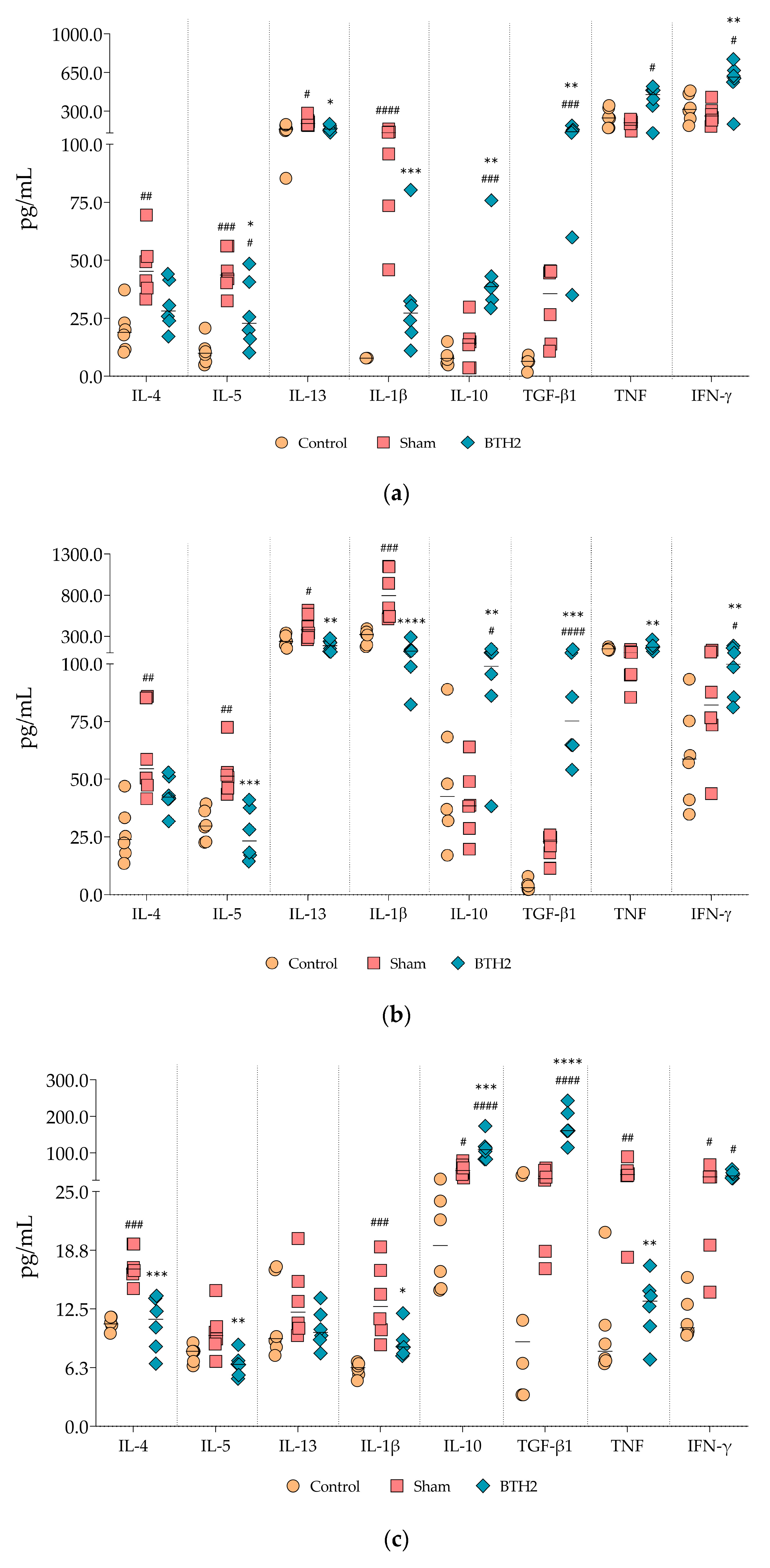 3.6. Treatment with Repeated Doses of BTH2 Downmodulates Th2 Cytokines and May Promote Th1-Biased and/or Regulatory Immune Responses