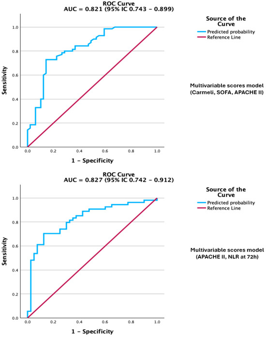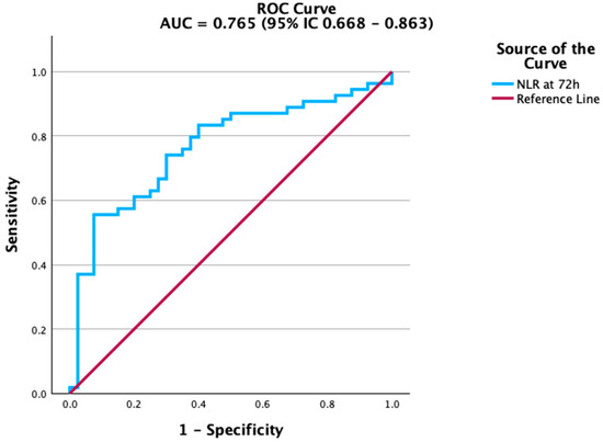 To assess prognostic value, we conducted ROC analyses for biomarkers measured at 72 h (Table 4). Among all variables, NLR (AUC = 0.765, 95% IC 0.668–0.863) demonstrated the strongest ability to distinguish survivors from non-survivors (Table 4; Figure 1).
