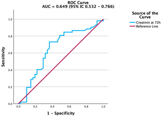 ROC curve of creatinine at 72 h for predicting mortality. Creatinine demonstrated modest but significant predictive ability.