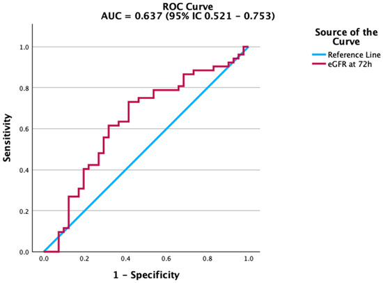 Renal function markers also contributed to mortality prediction. Creatinine levels at 72 h were significantly associated with adverse outcomes, although the accuracy was modest. The ROC curve in Figure 2 highlights this association, while estimated glomerular filtration rate (eGFR) (Figure 3) showed a similar, albeit weaker, predictive capacity. In contrast, platelet count and albumin did not achieve statistical significance. Their ROC curves are therefore provided in the Supplementary Material (Figures S1 and S2) for transparency. This aligns with previous studies indicating that the prognostic value of platelet counts and albumin is more evident in trajectory-based or composite indices rather than as isolated parameters.