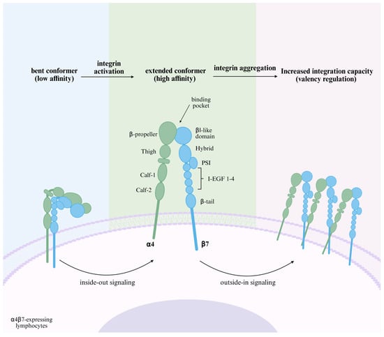 Schematic structure and affinity regulation of α4β7. α4β7 is bent in a quiescent state and the ligand-binding pocket is hidden from MAdCAM-1 binding. The “inside-out signaling” triggered by the binding of chemokines and their receptors induces conformational changes in the integrin structure, extending the domains and exposing the hidden ligand-binding pocket, which increases the affinity of α4β7 and begins to bind to MAdCAM-1. This ligand binding leads to integrin-mediated “outside-in signaling”, affecting cytoskeletal rearrangement, further aggregation of α4β7, and a change in ‘valency,’ which enhances adhesion strength [13]. Created in BioRender. Pan, Y. (2025) https://BioRender.com/hggjq78 (accessed on 6 March 2025).