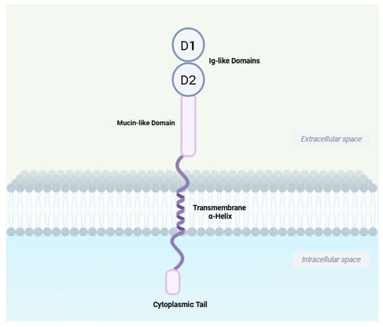 Schematic structure of MAdCAM-1. MAdCAM-1 contains two distal immunoglobulin-like structural domains, D1 and D2, which constitute the key structural elements for α4β7 binding; a mucin-like region which is the site of O-linked glycosylation and the L-selectin-binding domain; an α-helix transmembrane domain and a shorter cytoplasmic domain. Created in BioRender. Yu, C. (2025) https://BioRender.com/a5qc10v (accessed on 21 September 2025).