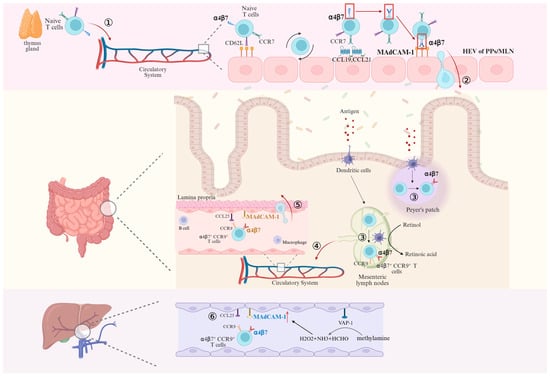 Activation of α4β7 on naïve T cells and migration of naïve and mature T cells mediated by binding of α4β7 to MAdCAM-1. ① After leaving the thymus, Naïve T lymphocytes enter the circulatory system and begin to slowly roll along endothelial cells through the “tethering” mainly mediated by L-selectin when passing through HEV. ② After activation of α4β7 mediated by CCR7, CCL19 and CCL21, the binding of α4β7 and MAdCAM-1 induces T cells to enter the Peyer’s patches (PPs) and mesenteric lymph nodes (MLN). ③ T cells encounter antigen-presenting dendritic cells in PPs and MLN that encode α4β7 expression in the presence of retinoic acid, differentiate into effector T cells highly expressing α4β7, and ④ subsequently return to the circulatory system via efferent lymphatics. ⑤ At this point, effector T cells that are highly expressing α4β7 can migrate into the lamina propria directly in binding to MAdCAM-1. ⑥ Effector T cells highly expressing α4β7 enter the liver parenchyma via hepatic sinusoidal endothelial cells in response to the inflammatory response after MAdCAM-1/α4β7 binding. Created in BioRender. Pan, Y. (2025) https://BioRender.com/2q5n9lo (accessed on 6 March 2025).