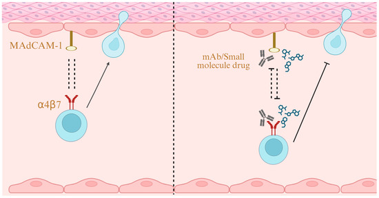 α4β7/MAdCAM-1 as a Drug Target. Blocking the interaction between MAdCAM-1 and α4β7 with monoclonal antibodies or small-molecule drugs inhibits lymphocyte migration, thereby ameliorating inflammation. Created in BioRender. Yu, C. (2025) https://BioRender.com/y44ph22 (accessed on 24 October 2025).
