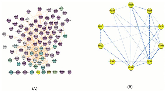3.3. Protein–Protein Interaction (PPI) Network and Hub Genes Analysis