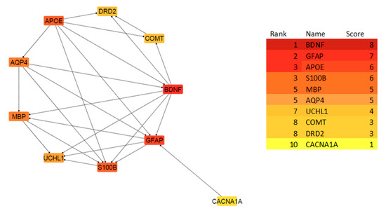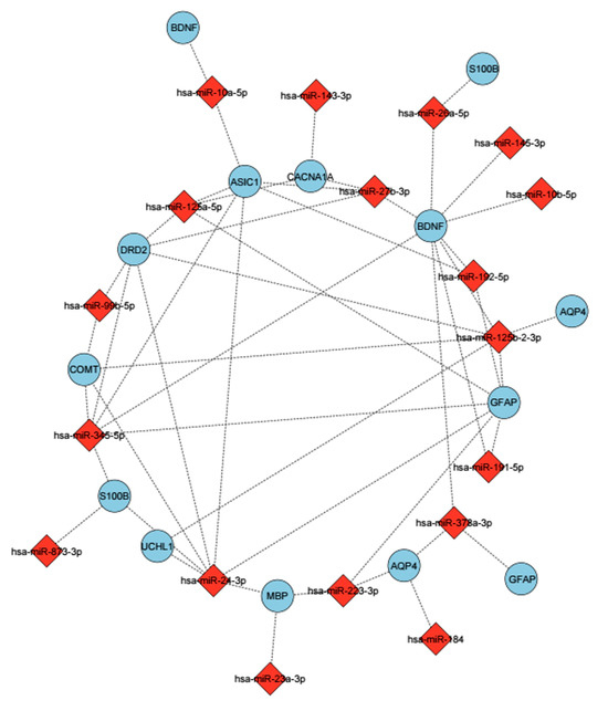| hsa-miR-125b-2-3p | 2.86 × 108 | 9.78 × 106 | GFAP, BDNF, AQP4, DRD2, COMT, UCHL1 | Synapse, regulation of nitrogen compound metabolic process, nervous system development |