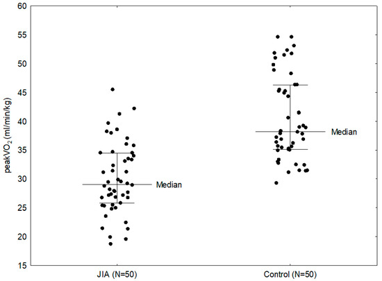 The study showed that patients with JIA had significantly lower peakVO2 compared to patients in the control group (29.05 vs. 38.20 mL/min/kg; p < 0.0001) (Figure 2). In addition, the statistically significant parameters in patients with JIA compared to the comparison group were: exercise load (144.00 vs. 223.00 W; p < 0.0001), METS (10.20 vs. 13.50; p < 0.0001), predicted peakVO2 (76% vs. 93%; p < 0.0001), VO2 (1.37 vs. 2.17 L/min; p <0.0001), VCO2 (1.66 vs. 2.52 L/min; p < 0.0001), O2 pulse (7.00 vs. 11.40 mL/beat; p < 0.0001), VE (55.50 vs. 84.50 L/min; p < 0.0001), VAT (19.45 vs. 23.10 L/min; p = 0.0001; 65.5% vs. 59%; p = 0.0004), RCP (24.65 vs. 28.70 L/min; p = 0.0002; 87.80% vs. 78.50%; p = 0.0018), OUES (1.62 vs. 2.17; p < 0.0001), CO (8.25 vs. 12.75 L/min; p < 0.0001) (Table 2). Children in the study group had significantly shorter exercise times (9:02 vs. 12:00 min), with lower workloads. Children with JIA reached VAT (03:19 vs. 05:16 min) and respiratory compensation threshold (06:46 vs. 08:43 min) significantly earlier with lower peakVO2 values than their healthy peers.