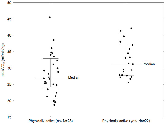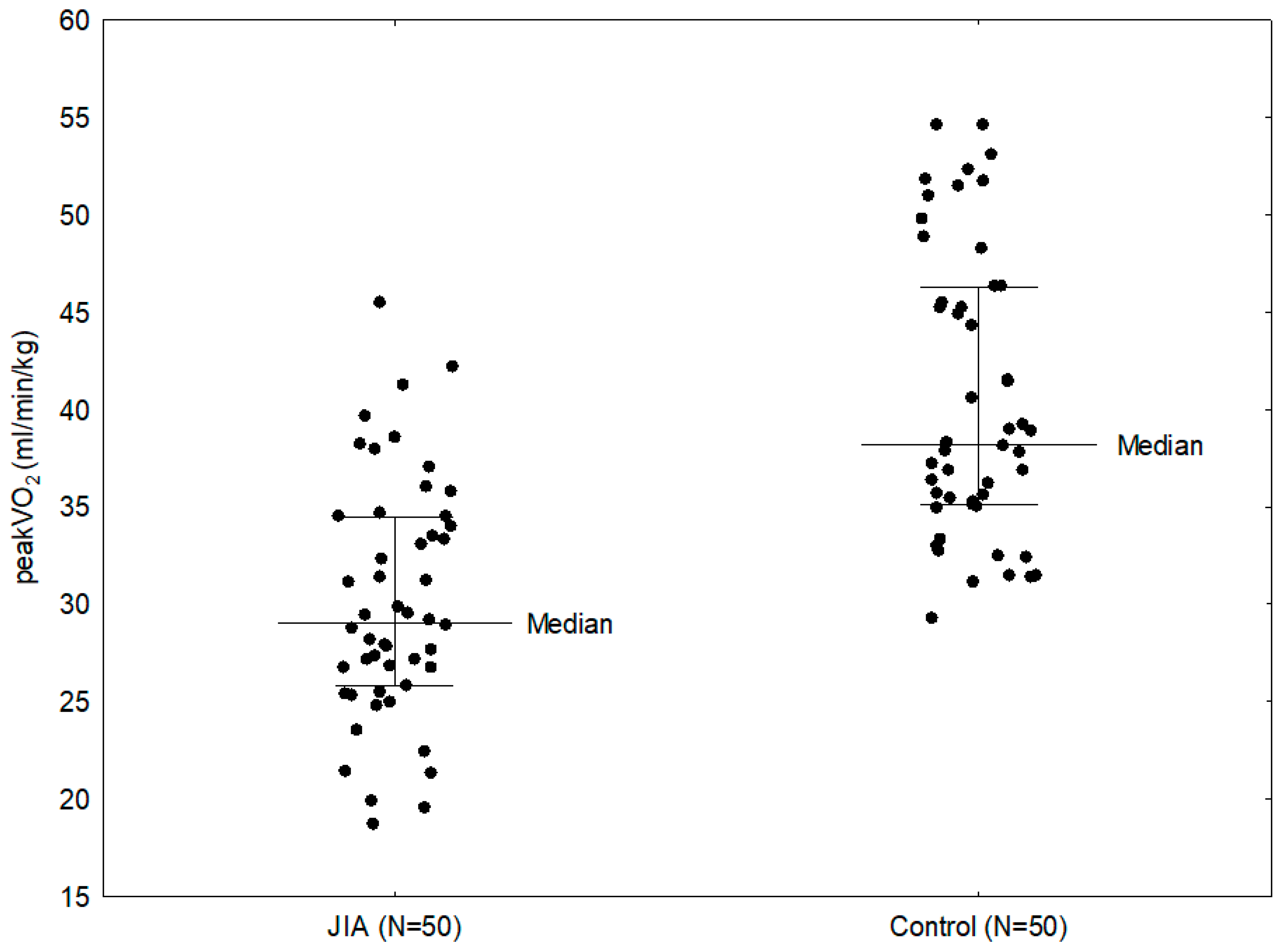 Comparison between peakVO2 in children with JIA who were physically active and those who did not exercise.