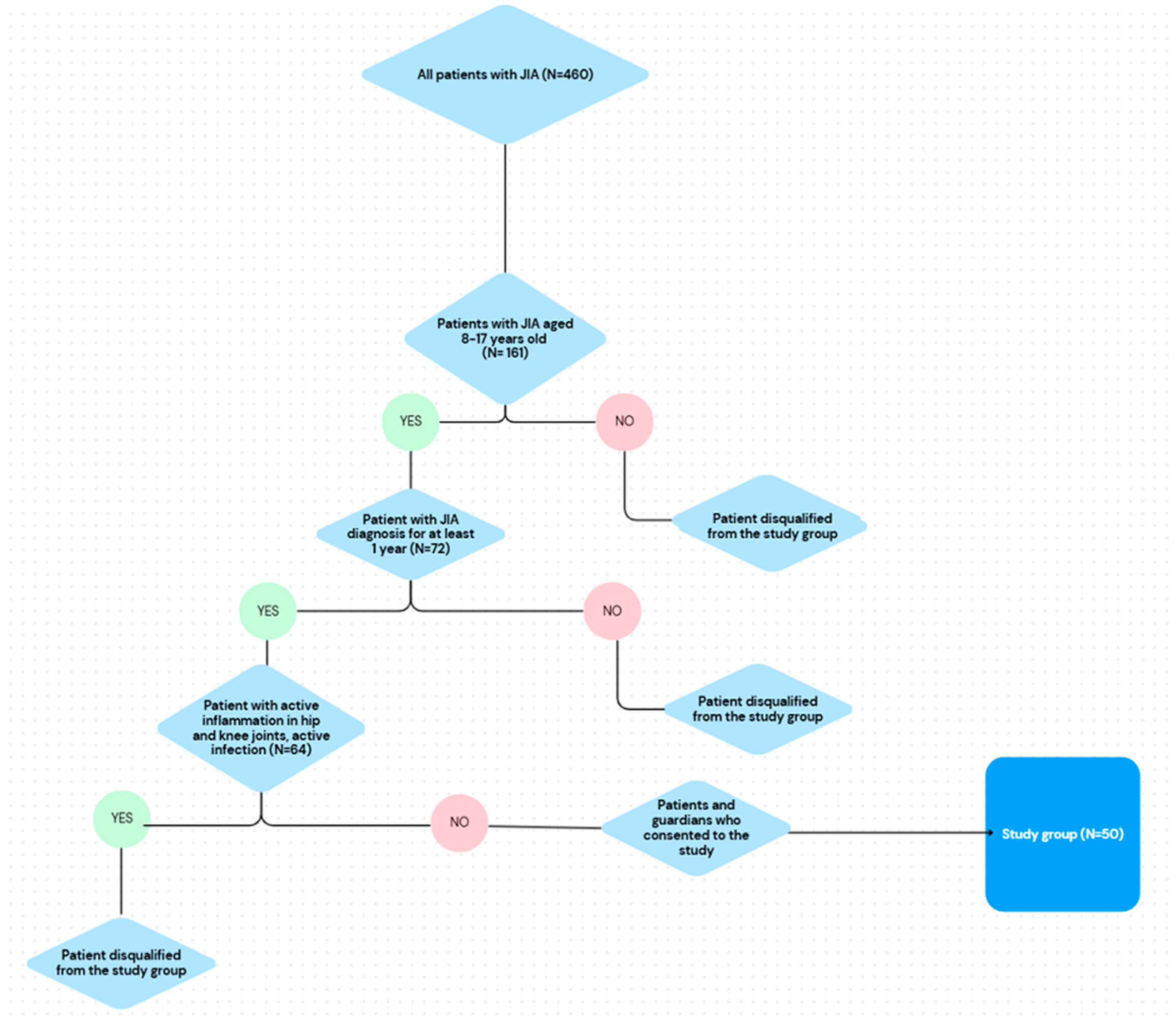 The study group consisted of 50 patients with JIA (82% female) hospitalized between December 2018 and March 2021. The patient selection process is presented on the flowchart (Figure 1) The median age of the patients was 12.50 years (25 pc = 10.00 years; 75 pc = 16.00 years), and the mean BMI equaled 19.60 kg/m2 (25 pc = 17.00 kg/m2; 75 pc = 22.10 kg/m2). The comparison group consisted of 50 patients and was selected according to age, sex and BMI. Disease activity was assessed using the CHAQ questionnaire and the median score equaled 0.13 points, as well as the JADAS-27 scale, with median of 5.50 points. The exclusion of patients with hip or knee involvement, which potentially indicates higher disease activity, is a limitation of this study and should be evaluated in further studies.