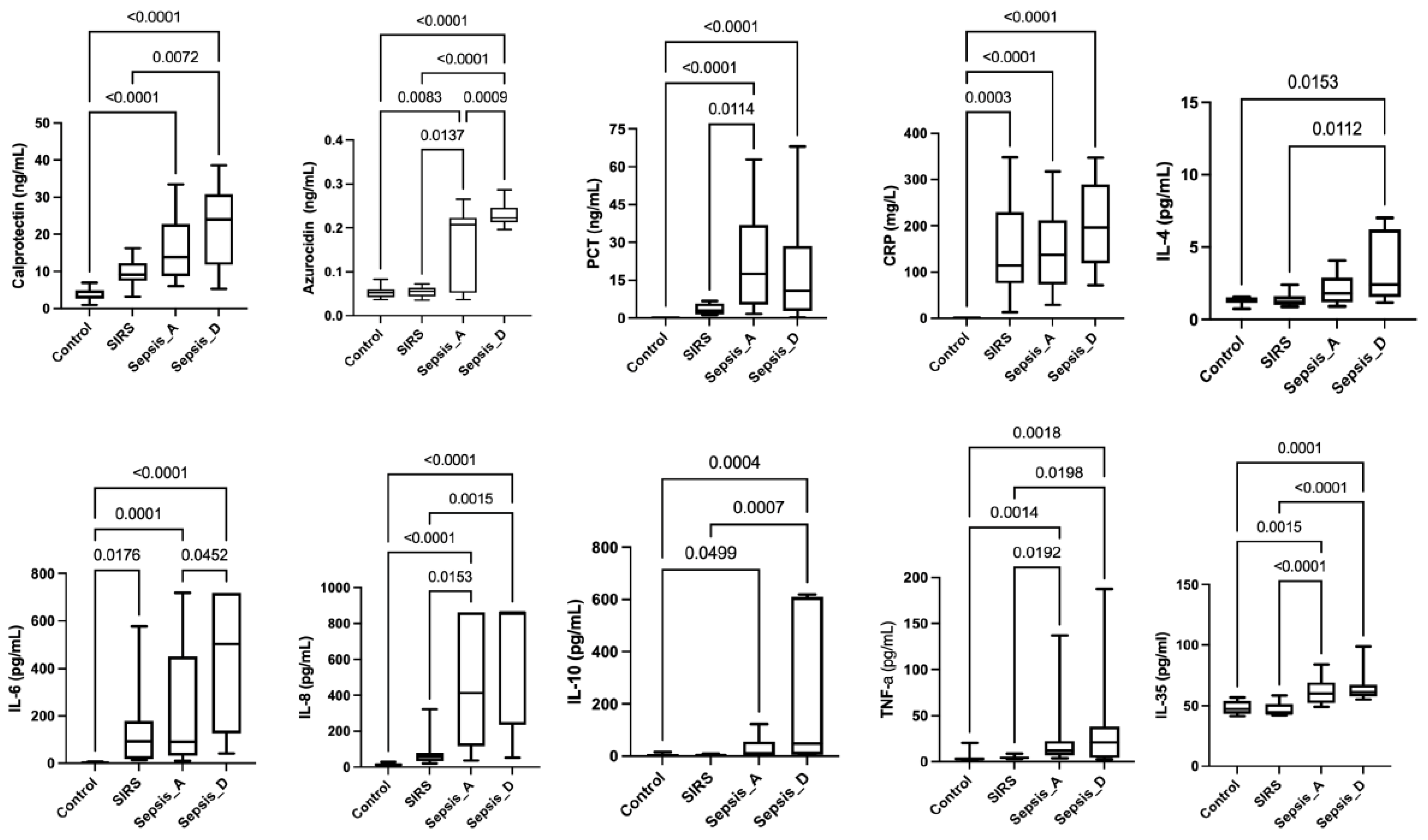| Control (n = 15) | SIRS (n = 15) | Sepsis_A (n = 92) | Sepsis_D (n = 29) | Kruskal–Wallis p-Values (H Statistic) | Dunn’s Test p-Values | |