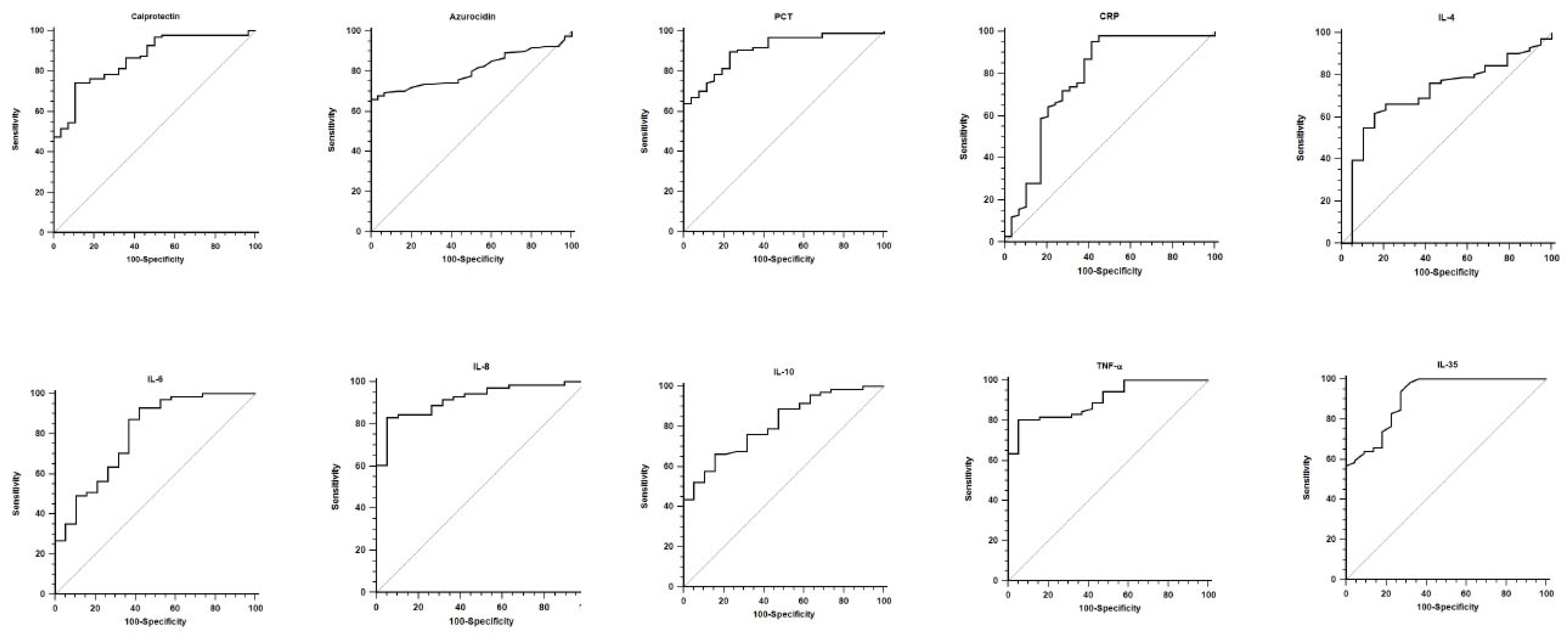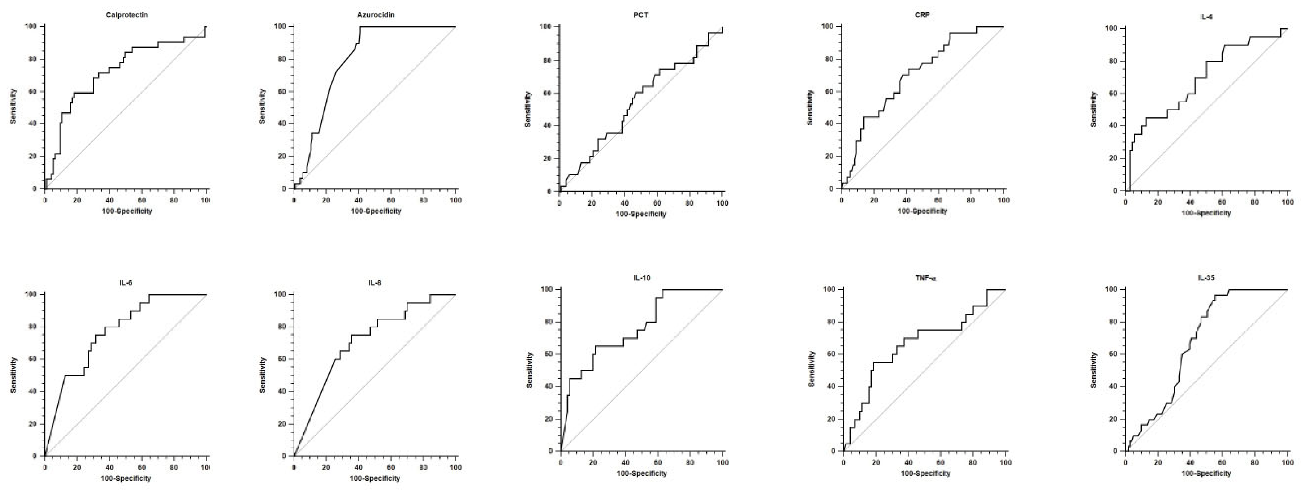 | Azurocidin | 0.796 [0.723–0.857] | <0.001 | 0.18 | 100.0 [88.1–100.0] | 59.0 [49.7–67.8] | 2.44 [2.0–3.0] | // | 36.7 [26.1–48.3] | 100.0 [95.0–100.0] |