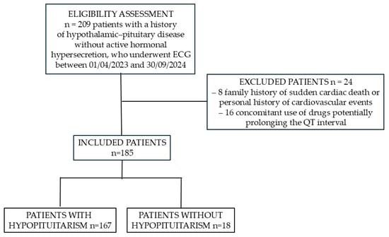 Between 1 April 2023, and 30 September 2024, at the Division of Endocrinology, Diabetes, and Metabolism, “Città della Salute e della Scienza” Hospital, Turin, a total of 209 ECG recordings were obtained from patients with a history of hypothalamic–pituitary disorders. Of these, 8 recordings were excluded due to a family history of sudden cardiac death or a personal history of cardiovascular events, and 16 were excluded because the patients were receiving medications potentially associated with QTc prolongation. Consequently, ECG tracings from 185 patients were analyzed (121 males; median age (IQR) 57.6 (23.4) years). Among these patients, 167 (90.3%) had some degree of hypopituitarism, whereas the remaining 18 (9.7%), although affected by pituitary disease, exhibited no hormonal deficiencies.