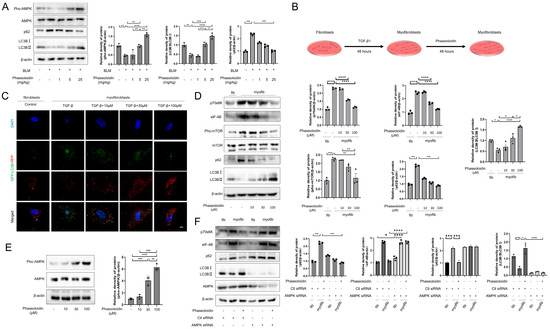 Autophagy is a biological process that is essential for the metabolic needs and renewal of organelles [21]. In vivo, phaseoloidin was found to activate AMPK as well as promote autophagy in lung tissue (Figure 2A). To determine whether phaseoloidin treatment could increase autophagy levels in myofibroblasts, myofibroblasts were generated via 48 h of TGF-β induction in primary mouse lung fibroblasts. Following the initial 48 h, another 48 h intervention with 10 μM, 30 μM, and 100 μM phaseoloidin (Figure 2B) was conducted. GFP-LC3B-RFP transfection and WB showed that the phaseoloidin treatment enhanced myofibroblasts’ autophagy levels (Figure 2C,D). Additionally, numerous studies have shown that mTORC1 is a crucial regulator of autophagy [22,23,24]. Furthermore, we examined the protein expression of p70S6K and elf-4B, the latter of which is the main effective downstream protein of mTORC1, representing its activity and regulating the autophagy statuses of cells (Figure 2D). Phaseoloidin levels were found to decrease phosphorylation of mTOR in a concentration gradient. Decreases in p70S6K and elf-4B levels followed, thereby promoting autophagy. Furthermore, phaseoloidin was found to reduce the expression of p62 and enhance the conversion of LC3B I to LC3B II, further supporting its role in facilitating autophagy (Figure 2D). AMPK, a heterotrimeric structure consisting of α, β, and γ subunits, is a pivotal molecule in preventing or delaying the formation of fibrosis and acts as the upstream signaler for the phosphorylation of mTOR(Ser2448) at the Thr172 site [13]. Therefore, we speculate that phaseoloidin may exert autophagy-promoting effects via AMPK. WB showed that phaseoloidin could active AMPK in a concentration gradient (Figure 2E). Moreover, AMPK siRNA reversed the decrease in p70S6K and elf-4B levels following phaseoloidin treatment. Moreover, the results regarding p62 and LC3B were also reversed (Figure 2F). Collectively, phaseoloidin can promote autophagy via the AMPK/mTOR pathway.