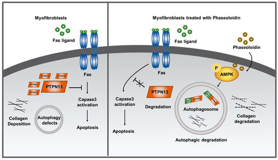 Numerous studies have shown that complex interactions take place between autophagy and apoptosis [26,27,28,51]. Among them, classical apoptosis regulators can regulate autophagy, and autophagy can likewise promote apoptosis [52,53,54]. Furuya et al. found simultaneous upregulation of apoptosis and autophagy in ceramide-treated breast and colon cancer [55]. Fitzwalter et al. explored differences in the responses of cells with different levels of autophagic flux to cell-death stimuli; strikingly, they found that BJAB leukemia cells with high autophagic flux were more sensitive to FasL-induced apoptosis than lower-autophagic-flux cells [56]. PTPN13 plays a critical regulatory role as a link between autophagy and apoptosis. Recent studies have shown that genetic defects in PTP-BL, the mouse homolog of concurrent human PTPN13, reduce bleomycin-induced pulmonary fibrosis in mice [48]. In this study, we found that phaseoloidin could decrease the expression of PTPN13. We demonstrated that phaseoloidin decreases PTPN13 expression through co-degradation of PTPN13 and p62, suggesting that PTPN13 may serve as a critical therapeutic target of phaseoloidin. While we identified PTPN13 as a critical mediator in the phaseoloidin-induced reversal of apoptosis resistance, its precise molecular mechanisms remain incompletely elucidated. Therefore, our data indicate that the phaseoloidin-induced reversal of apoptosis resistance in myofibroblasts may be mediated by PTPN13.