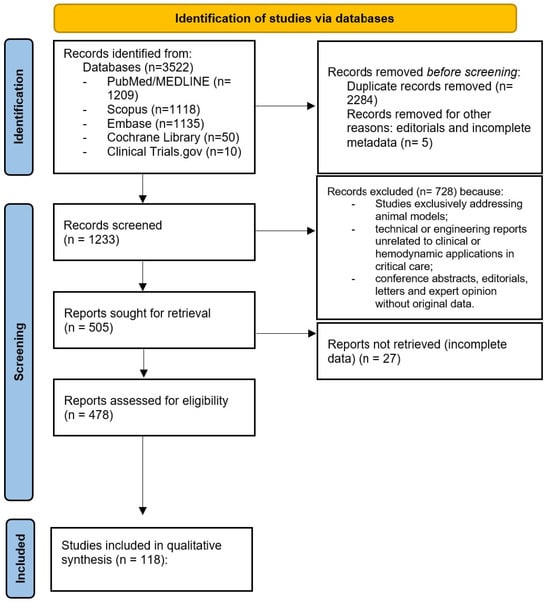 Eligible articles included original clinical investigations, observational cohorts, case series, case reports, and review articles addressing the use of transesophageal echocardiography in acute or critical care settings, including its application in shock, cardiac arrest, pulmonary embolism, pericardial tamponade, and extracorporeal membrane oxygenation (ECMO). Studies were also included if they explored technological innovations, such as three-dimensional imaging, miniaturized probes, or artificial intelligence, relevant to emergency and intensive care practice. Exclusion criteria were as follows: studies exclusively addressing animal models; technical or engineering reports unrelated to clinical or hemodynamic applications in critical care; and conference abstracts, editorials, letters, and expert opinions without original data. Given the heterogeneity in study design, patient population, imaging protocols, and reported outcomes, no formal meta-analysis or statistical heterogeneity testing was performed. The evidence was therefore synthesized qualitatively, emphasizing methodological rigor, reproducibility, and clinical relevance. Quantitative parameters were incorporated where available, and limitations related to operator dependency and technological variability were explicitly acknowledged. Although this work was designed as a narrative review rather than a systematic one, a PRISMA-style flow diagram was nevertheless included to enhance transparency and reproducibility in the literature selection process, outlining the number of records identified, screened, assessed for eligibility, and included in the final quantitative synthesis (Figure 1).