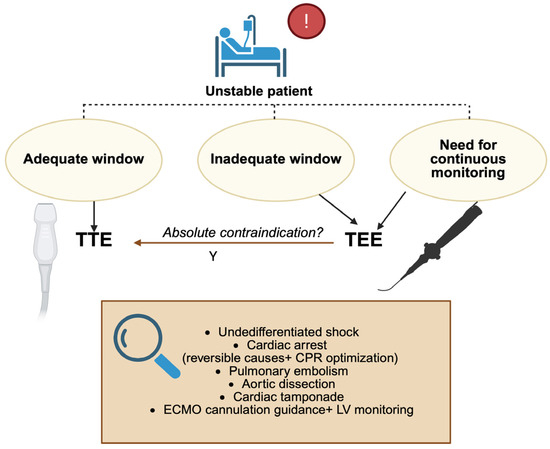 In the intensive care unit (ICU), this superiority translates into more reliable assessment of ventricular filling, contractile performance, and outflow hemodynamics in patients with undifferentiated or evolving shock. Unlike TTE, which may yield equivocal findings, TEE enables continuous or repeated monitoring and thereby guides titration of fluids, vasoactive agents, or mechanical circulatory support with greater precision [14]. Its value is especially evident during ECMO, where TEE not only facilitates accurate cannula positioning but also permits real-time evaluation of ventricular unloading and early detection of complications that might be missed with TTE [15]. The emergency department (ED) represents another domain in which the distinction between TEE and TTE is critical [16]. TTE is often attempted first in cardiac arrest or shock, but its utility is limited when image quality is compromised or when chest compressions must not be interrupted. Focused or resuscitative TEE provides uninterrupted, high-fidelity visualization throughout resuscitation, enabling immediate identification of reversible causes such as cardiac tamponade, pulmonary embolism, or acute aortic syndromes [17,18]. Moreover, TEE has proven superior to TTE in differentiating true electromechanical dissociation from pseudo-pulseless electrical activity and in guiding chest compression placement to optimize cardiac output [19,20]. Taken together, these attributes underscore the complementary but unequal roles of the two modalities: TTE remains an accessible, first-line tool, whereas TEE emerges as the most reliable option whenever immediate, high-quality cardiac imaging is required for life-saving decision-making in both the ICU and ED (Figure 3).