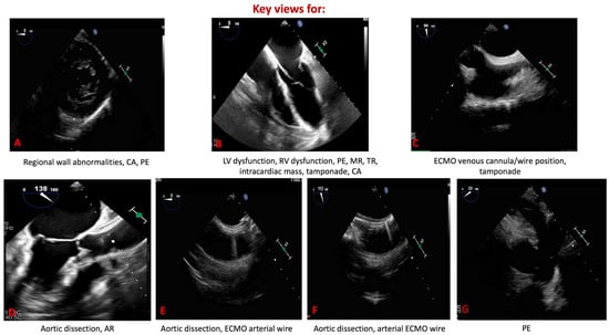 Key transesophageal echocardiographic views in emergency and critical care. (A) Trans-gastric mid-papillary short axis. (B) Mid-esophageal four-chamber view. (C) Mid-esophageal bicaval view. (D) Mid-esophageal aortic valve axis view. (E) Mid-esophageal short-axis aortic view. (F) Mid-esophageal aortic long axis view. (G) Mid-esophageal short-axis view of the ascending aorta. CA: cardiac arrest; PE: pulmonary embolism; LV: left ventricle; RV: right ventricle; MR: mitral regurgitation; TR: tricuspid regurgitation; ECMO: extracorporeal membrane oxygenation; AR: aortic regurgitation.