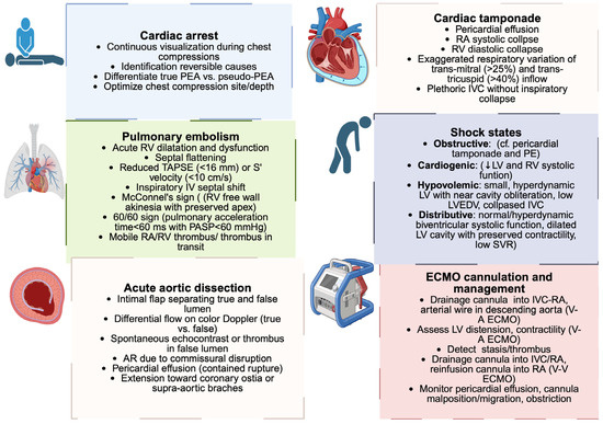 Echocardiographic findings in acute cardiovascular emergencies. Schematic overview of the main clinical conditions in which TEE plays a role: cardiac tamponade, pulmonary embolism, acute aortic dissection, cardiac arrest, ECMO cannulation, and the differentiation of shock states. Each box highlights the key echocardiographic features that support rapid diagnosis in an acute care setting. PEA: pulseless electrical activity; RA: right atrium; RV: right ventricle; IVC: inferior vena cava; PE: pulmonary embolism; LV: left ventricle; LVEDV: left ventricular end-diastolic volume; SVR: systolic vascular resistance; PASP: pulmonary arterial systolic pressure; TAPSE: tricuspid annular plane systolic excursion; AR: aortic regurgitation; ECMO: extracorporeal membrane oxygenation; V-A: veno-arterial; V-V: veno-venous. Created in BioRender. Pirri, C. (2025) https://BioRender.com/o2c04su.