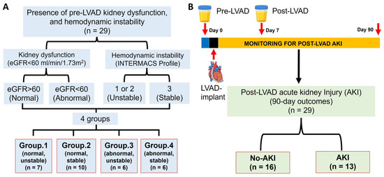 Schematic representations of the study design algorithm. (A) Patients are classified based on pre-LVAD kidney dysfunction and hemodynamic instability; (B) A timeline for urine sampling and patient grouping by the occurrence of post-LVAD AKI or the absence of it. LVAD stands for left ventricular assist device; eGFR refers to estimated glomerular filtration rate; AKI indicates acute kidney injury; and INTERMACS refers to the interagency registry for mechanically assisted circulatory support.