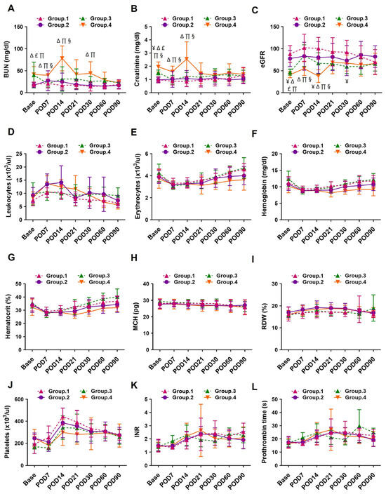Temporal changes in (A) BUN, (B) Creatinine, (C) eGFR, (D) Leukocytes count, (E) Erythrocytes count, (F) Hemoglobin, (G) Hematocrit, (H) MCH, (I) RDW, (J) Platelets count, (K) INR and (L) Prothrombin time at the baseline and multiple time points after LVAD implantation among 4 groups of patients based on pre-LVAD kidney function and hemodynamic stability. Data are expressed as mean ± SD, p < 0.05 is considered significant. ¥: Group 1 vs. Group 3; ∆: Group 1 vs. Group 4; £: Group 2 vs. Group 3; ∏: Group 2 vs. Group 4; §: Group 3 vs. Group 4. BUN, blood urea nitrogen; eGFR, estimated glomerular filtration rate; MCH, mean corpuscular hemoglobin; RDW, red cell distribution width; INR, international normalized ratio; POD, post-operative day.
