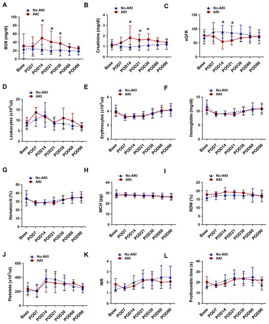 Temporal changes in (A) BUN, (B) Creatinine, (C) eGFR, (D) Leukocytes count, (E) Erythrocytes count, (F) Hemoglobin, (G) Hematocrit, (H) MCH, (I) RDW, (J) Platelets count, (K) INR and (L) Prothrombin time at the baseline and multiple time points after LVAD implantation between AKI group patients and the no-AKI group patients. Data are expressed as mean ± SD, * p < 0.05 is considered significant. AKI, acute kidney injury; BUN, blood urea nitrogen; eGFR, estimated glomerular filtration rate; MCH, mean corpuscular hemoglobin; RDW, red cell distribution width; INR, international normalized ratio; POD, post-operative day.