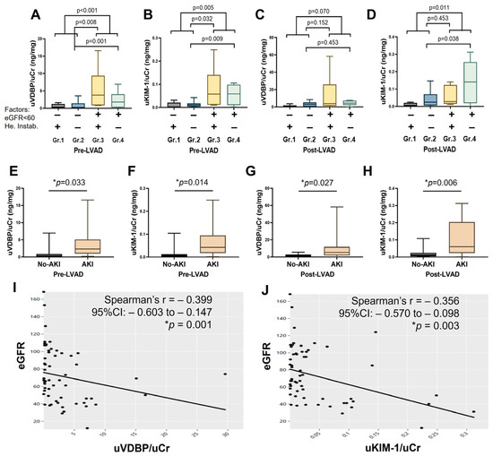 Box-and-whisker plots showing urinary biomarker levels before (pre-) and after (post-) LVAD implantation. (A,B) Pre-LVAD urinary VDBP and KIM-1 (normalized to urinary creatinine) across four patient groups categorized by baseline kidney function and hemodynamic stability. (C,D) Post-LVAD urinary VDBP and KIM-1 levels among the same four groups. (E,F) Pre-LVAD urinary VDBP and KIM-1 levels in patients with and without postoperative AKI. (G,H) Post-LVAD urinary VDBP and KIM-1 levels in AKI versus no-AKI groups. (I,J) Spearman’s rank correlation between urinary VDBP, KIM-1 (normalized to urinary creatinine), and eGFR. Data are expressed as mean ± SD, * p < 0.05 is considered significant. AKI, acute kidney injury; uVDBP, urinary Vitamin D binding protein; uKIM-1, urinary kidney injury molecule-1; uCr, urinary creatinine; CI, confidence intervals; eGFR, estimated glomerular filtration rate; Group 1 (Gr.1), normal kidney function with unstable hemodynamics; Group 2 (Gr.2), normal kidney function with stable hemodynamics; Group 3 (Gr.3), impaired kidney function with unstable hemodynamics; Group 4 (Gr.4), impaired kidney function with stable hemodynamics.