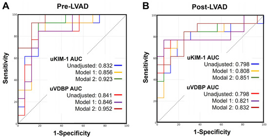 ROC curves of the pre-LVAD urinary VDBP, KIM-1, and adjusted clinical models (A) and post-LVAD urinary VDBP, KIM-1, and adjusted clinical models (B) for predicting AKI within 90 days after LVAD implantation. AKI, acute kidney injury; LVAD, left ventricular assist device; ROC, receiver operating characteristic.