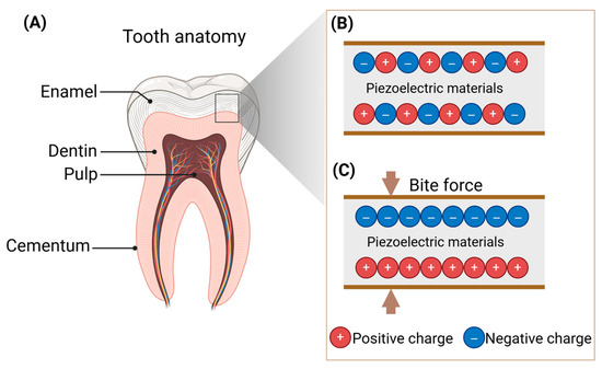 The anatomy of teeth and the piezoelectric principle. (A) The anatomy of teeth. (B,C) Teeth generating electrical charges under biting force. Created in BioRender. Zhao, C. (2025) https://BioRender.com/u928znc.
