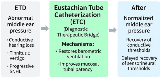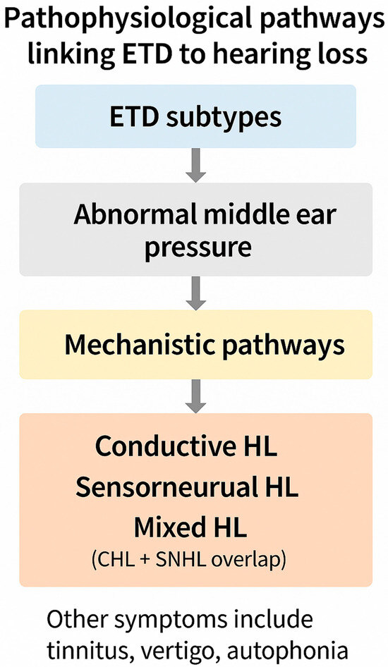 Traditionally, HL has been divided into conductive, sensorineural, and mixed categories, a framework codified in classic audiological classification systems [6] and reinforced in modern otologic texts that elaborate the structural and functional role of the Eustachian tube (ET) [7]. While conductive forms have often been considered transient and reversible, emerging evidence suggests that Eustachian tube dysfunction (ETD) is a crucial upstream factor contributing not only to conductive loss but also to sensorineural (SNHL) and mixed hearing loss (MHL) [8,9,10].