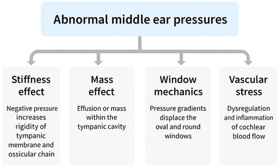 Although differing in etiology, all ETD subtypes converge on the same mechanistic pathways—stiffness, mass, window mechanics, and vascular stress. Negative MEP may initially stiffen the TM, while effusion imposes inertial loading. At the same time, pressure gradients across the cochlear windows disturb fluid dynamics, and chronic stress compromises strial vascular supply. The clinical outcome depends on which of these processes dominates and how they interact over time.