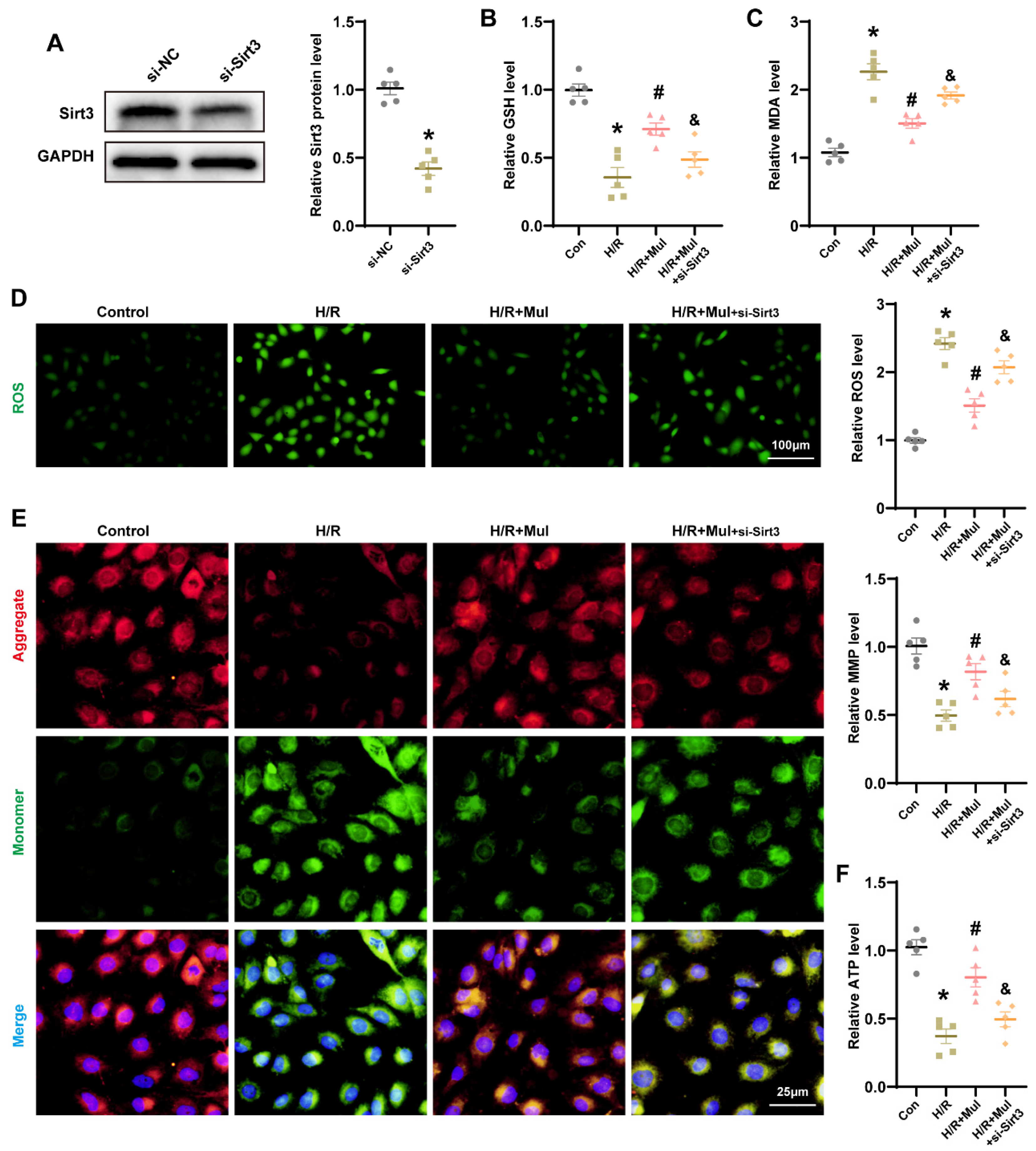 3.6. The Reduction of SIRT3 Hindered Mul’s Ability to Combat Oxidative Stress Triggered by H/R