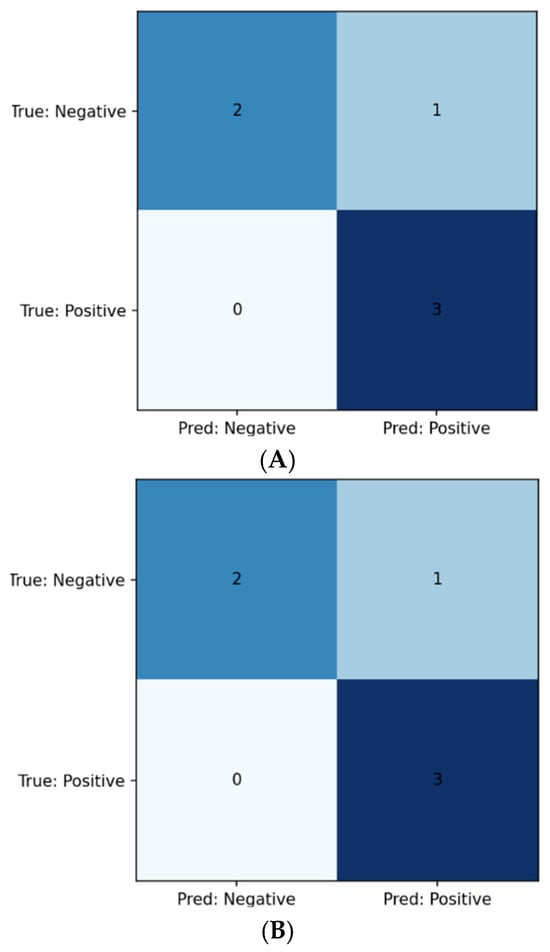With hyperparameters selected as in Table 4, the logistic regression classifier yielded identical class-wise test metrics to the SVM (Table 5): Class 0 Precision 1.000, Recall 0.667, F1 0.800 Class 1 Precision 0.750, Recall 1.000, F1 0.857. The ROC–AUC was 0.889. The confusion matrix appears in Figure 2B.