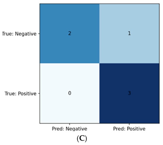 Following α optimization, the Ridge classifier produced the same class-wise test metrics as the regression model, seen in (Table 6): Class 0 Precision 1.000, Recall 0.667, F1 0.800; Class 1 Precision 0.750, Recall 1.000, F1 0.857. Using the continuous decision scores, the ROC–AUC was 1.000. The confusion matrix is shown in Figure 2C.