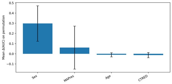 PFI analysis for SVM model. The bar plot shows a relatively high mean of sex contribution to AUC disruption upon feature permutation (tall blue column), which is accompanied by a high variance (long black whiskers), due to limited sample folds. Meanwhile, AUC appears to depend less on MAPres, but the high variance that is introduced by the different dependency level in each fold renders the result ambiguous. Additionally, the slight variance associated with age and CTRED shows that the model did not depend on those features as much as on sex and age; however, their importance should not be downplayed.
