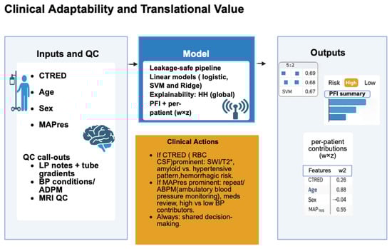 Despite this progress, a significant unmet need persists in determining which individuals are most at risk for rapid hippocampal volume decline. That stratification could help structure the visit timeline, therapeutic timeline (anti-amyloid or vascular risk management strategies), and stratification for clinical trials [10]. While previous prognostic models have used multimodal biomarkers like genetics, PET, MRI, and clinical data or imaging deep learning, many of these methods are still hard to implement in everyday clinical practice because of their cost and complex Pipelines [11,12]. In addition, many high-performance ML systems are also “black boxes,” limiting transparency and clinical trust. Efforts toward quantitatively interpretable architectures aim to bridge this gap by exposing feature contributions [13,14]. Recent studies confirm that although many prediction models report high performance, most remain unvalidated externally, and their complexity challenges translation to routine practice [15,16]. Therefore, this underscores the benefit of intrinsically interpretable models in high-stakes domains like neurology [17]. Given the large patient volume and the high costs and delays associated with complex tests like PET scans and genetic analysis, there is an urgent demand for interpretable standard ML frameworks that produce biologically plausible predictions from routinely available data. Beyond the standard amyloid and tau measures, vascular and demographic features influence neurodegeneration [18]. Age and sex are the strong non-modifiable risk factors, while blood pressure has been reported to accelerate atrophy through various hemodynamic mechanisms. Women’s brain atrophy rates were roughly 1.5% higher than men’s, while younger individuals exhibited atrophy rates about 1% higher than older ones due to higher tau levels [11,18]. The role of blood pressure (BP) in hippocampal atrophy is highly complex. High BP in midlife has been associated with increased brain atrophy later in life. Studies on older individuals have shown the reverse, where low BP was associated with enhanced neurodegeneration [19]. Furthermore, high blood pressure is often associated with white matter lesions (WMLs), contributing to brain atrophy [19,20]. These variables are readily available, which justifies their inclusion in prognostic models.
