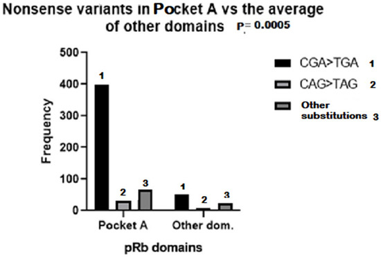 Frequency of CGA > TGA (1), CAG > TAG (2) and other nonsense substitutions (3) in RB1 regions corresponding to pRB Pocket A and other domains, in which the frequency was calculated as the average of the sum of all domains except Pocket A. (Variants in Pocket A domain vs. the average of other domains).
