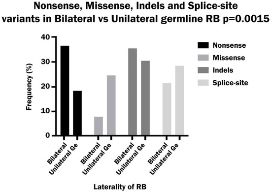 A comparison of the different classes of variants between bilateral and unilateral hereditary patients showed a significant difference between the two groups. Nonsense variants occurred with a significantly higher frequency in bilateral than in unilateral patients, while missense variants were significantly more frequent in unilateral than in bilateral patients. On the other hand, the indel variants were more frequent in bilateral patients and the splice-site variants were more frequent in unilateral patients, but the differences were not significant (Figure 6).