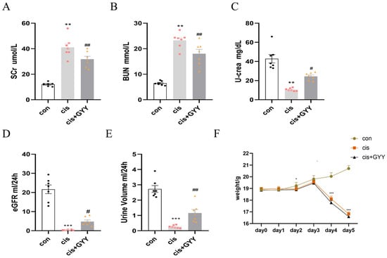 Therapeutic effects of exogenous H2S on renal function. (A,B) Scr and BUN levels; (C) Urinary creatinine excretion; (D) estimated glomerular filtration rate; (E) urine output measurement; (F) body weight changes. Data represent the mean ± SEM (n = 7/group). Statistical significance: * p < 0.05, ** p < 0.01, *** p < 0.001 (control vs. cisplatin); # p < 0.05, ## p < 0.01, ### p < 0.001 (cisplatin vs. cisplatin + GYY).