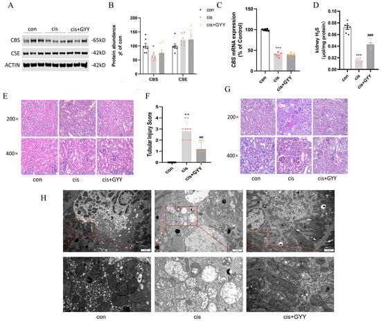 Renal CBS was reduced in cis-AKI mice, and H2S alleviated the pathological damage. (A) Representative Western blot images of CBS and CSE expression. (B) Quantitative analysis of enzyme protein levels. (C) mRNA expression of CBS. (D) Kidney H2S levels. (E) H&E staining showing characteristic tubular damage. (F) Quantitative assessment of pathological injury scores. (G) PAS-stained renal sections. The cisplatin-treated mice exhibited impairment in AKI pathological changes, such as vacuolar degeneration of tubular epithelium, brush border loss, and structural disorganization (200× and 400× magnification; scale bars = 50 μm). The GYY-treated mice alleviated renal tubular injury. (H) Mitochondria in a transmission electron microscope (scale bars = 2 μm, second row: 500 nm). Data represent the mean ± SEM (n = 7/group). Statistical significance: * p < 0.05, ** p < 0.01, *** p < 0.001 (control vs. cisplatin); # p < 0.05, ## p < 0.01, ### p < 0.001 (cisplatin vs. cisplatin + GYY).