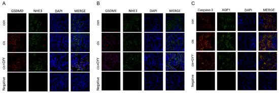 To investigate the spatial expression of gasdermin proteins in renal tissues, dual immunofluorescence staining was performed for GSDMD/NHE3 and GSDME/NHE3, utilizing NHE3 as a definitive apical membrane marker of proximal tubules []. Fluorescence microscopy revealed distinct co-localization signals (manifested as yellow regions in merged channels) along the brush border membranes, confirming the tubular epithelial localization of both gasdermin proteins. GSDMD and GSDME immunoreactivity was weaker in cisplatin + GYY4137-treated specimens compared with cisplatin-exposed controls (Figure 4A,B). These observations corroborated that GYY4137 inhibited cisplatin-induced apoptosis, pyroptosis, and inflammation. Additionally, co-localization in renal proximal tubules demonstrated concurrent expression of caspase-3 with AQP1, an established apical membrane marker [], exhibiting distribution patterns concordant with GSDME/GSDMD expression trends (Figure 4C).