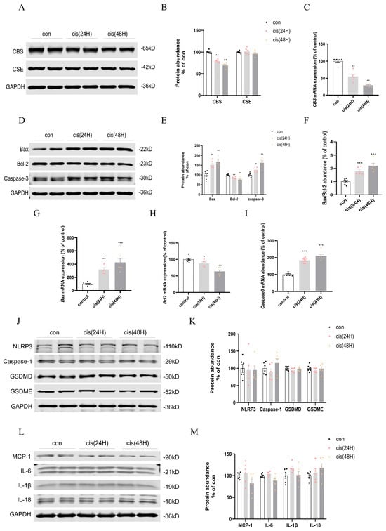 Temporal modulation of H2S-synthesizing enzymes and cell death pathways in cisplatin nephrotoxicity. (A) CBS/CSE Western blot. (B) CBS/CSE protein quantification. (C) mRNA level of CBS. (D) Bax/Bcl-2/Caspase-3 Western blot. (E) Bax/Bcl-2/Caspase-3 protein quantification. (F) Bax/Bcl-2 dynamics. (G–I) Bax/Bcl-2/Caspase-3 mRNA expression. (J) NLRP3/Caspase-1/GSDMD/GSDME Western blot. (K) NLRP3/Caspase-1/GSDMD/GSDME mRNA expression. (L) MCP-1/IL-6/IL-18/IL-1β Western blot. (M) MCP-1/IL-6/IL-18/IL-1β mRNA expression. Data represent mean ± SEM (n = 6/group). Statistical significance: * p < 0.05, ** p < 0.01, *** p < 0.001 (control vs. cisplatin).