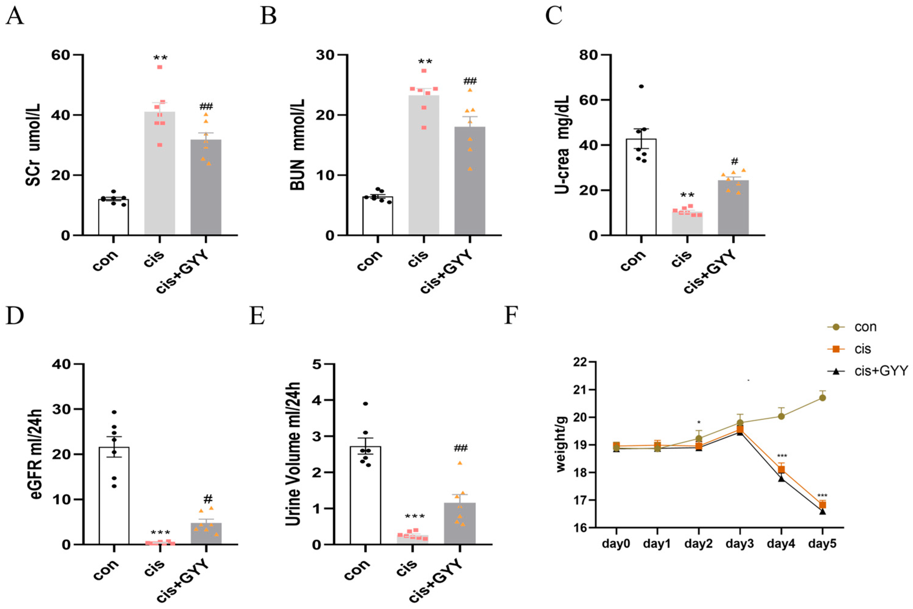 3.1. Impact of GYY4137 on Renal Function in cis-AKI Mice